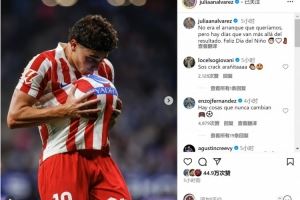 阿尔瓦雷斯社媒晒出庆祝进球的照片,配文:“这不是我们想要的开局,但有一些日子超越了比赛结果,儿童节快乐!”