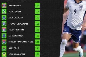 本赛季英格兰球员评分榜:凯恩高居榜首,格伊次席,格拉利什第三